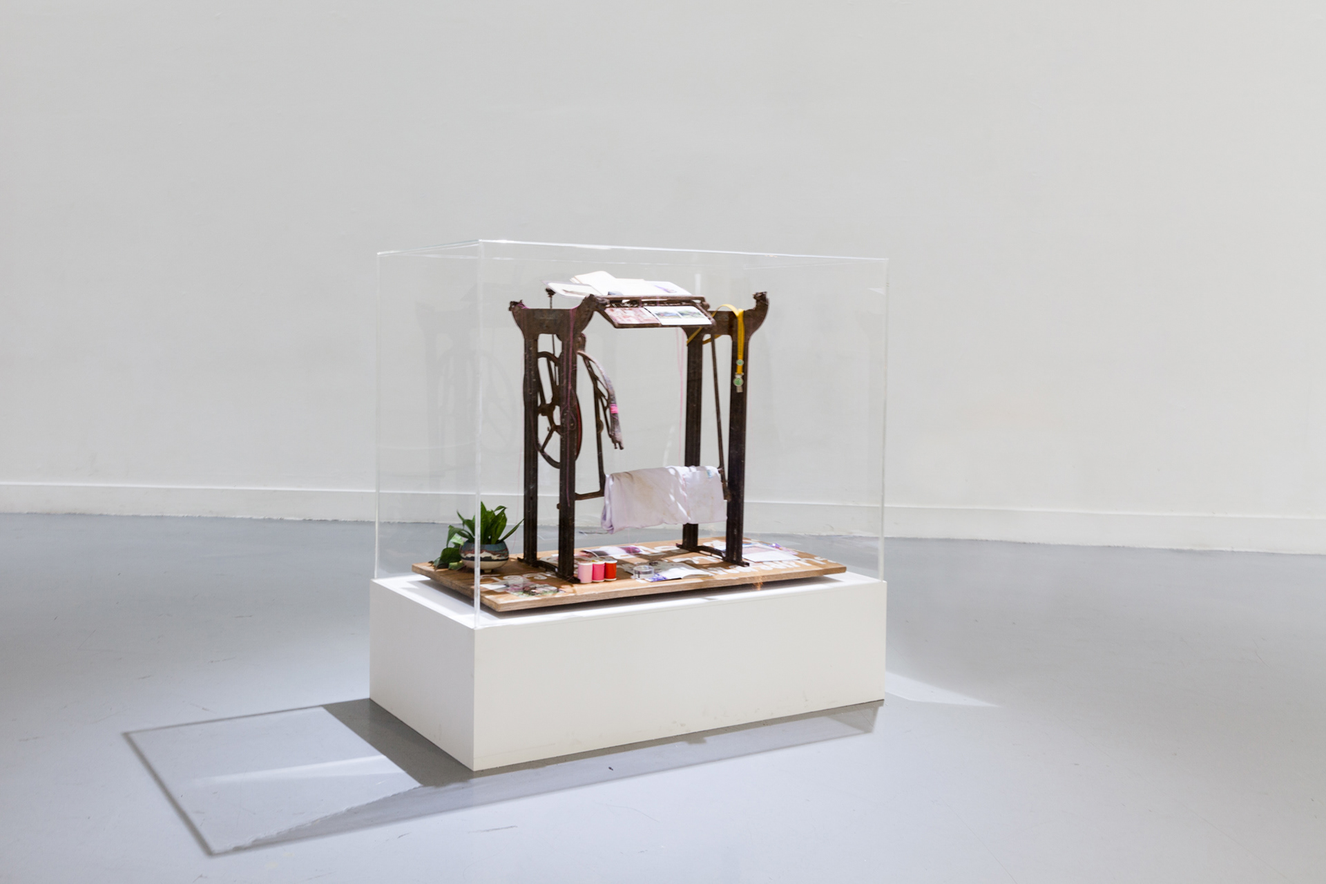 identity, Installation, soil, plants, body waste, old photograph, Sewing machine table, old book, used white cloths Video 5.08 min